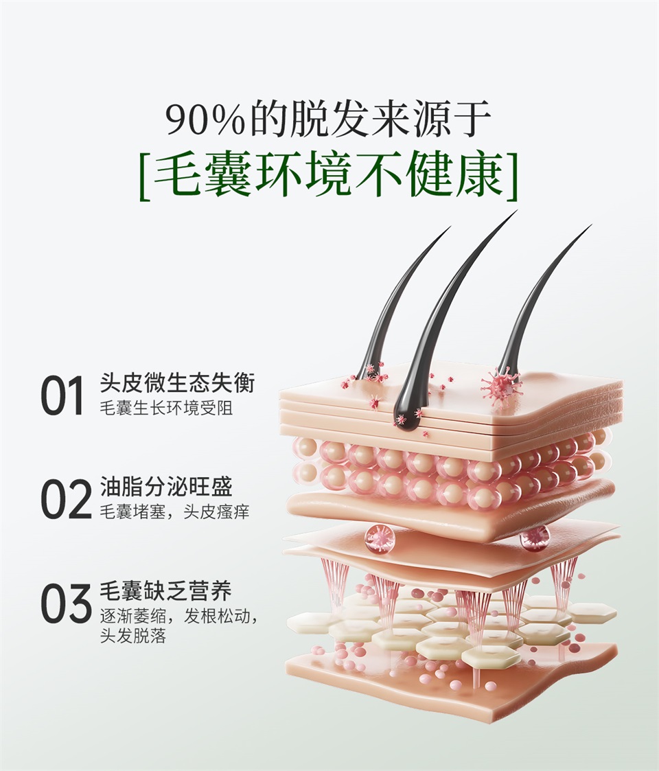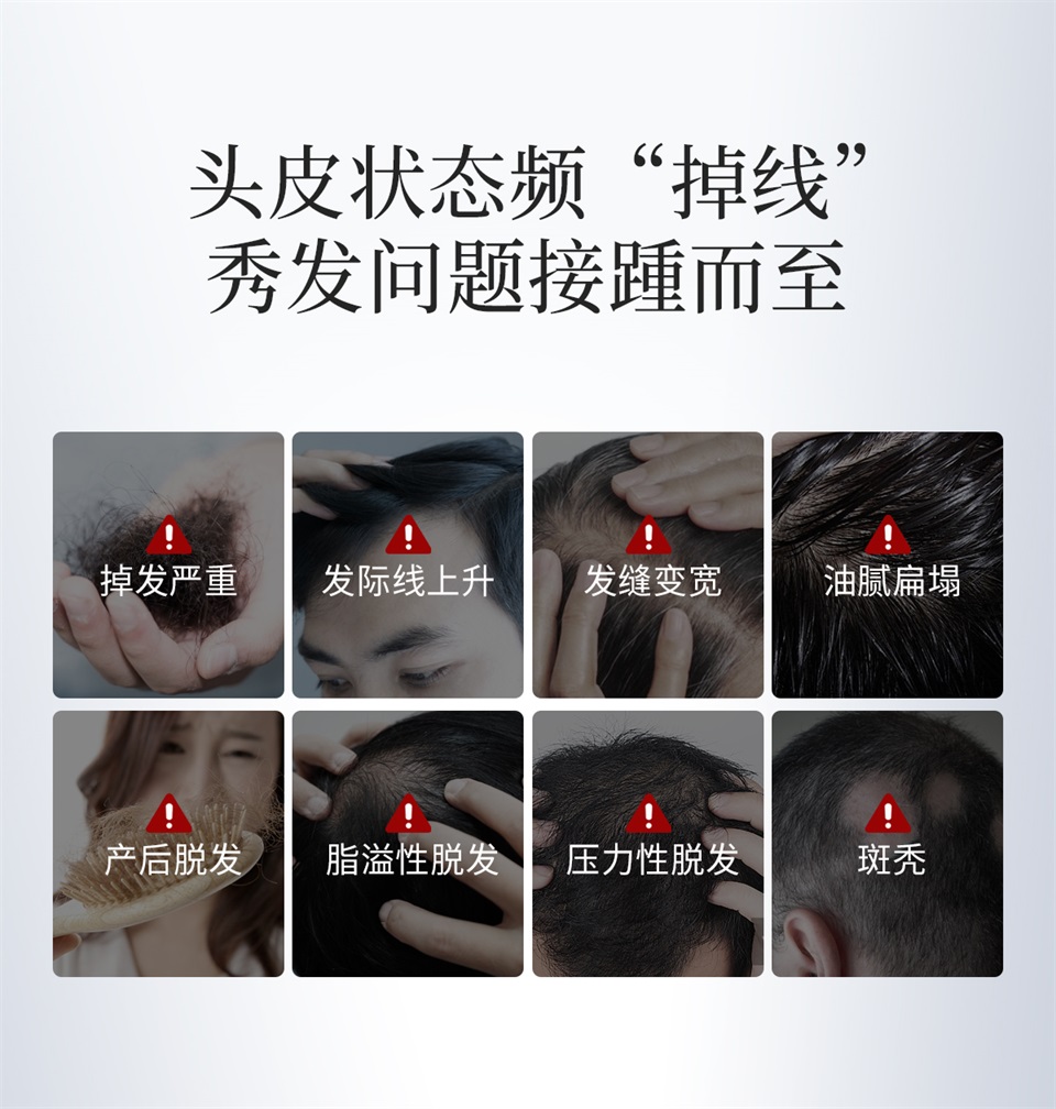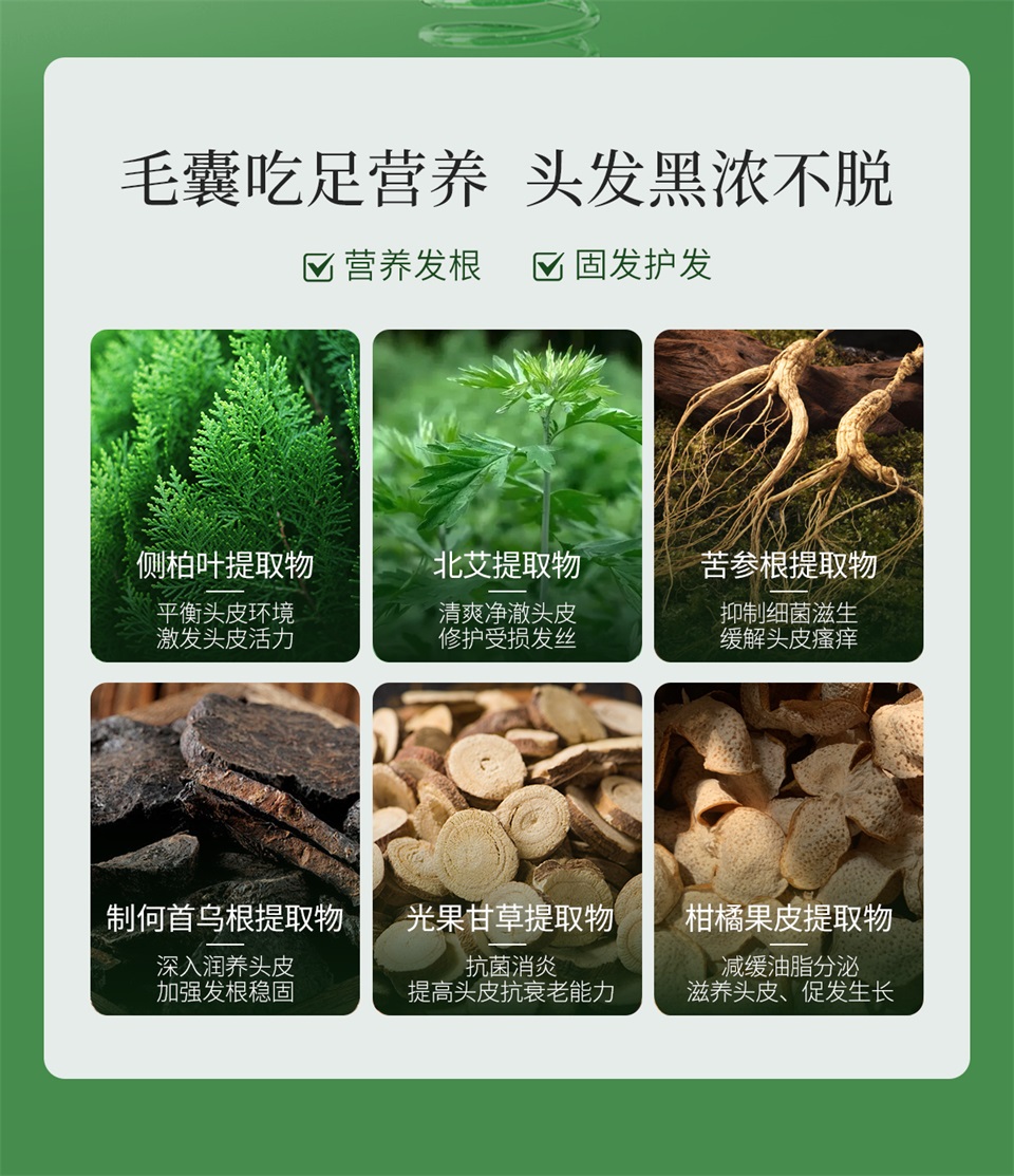 适宜人群:各种类型脱发人群。 作      用:含有侧柏叶、制何首乌、北艾、光果甘草等草本精粹提取物,净护滋润头皮,呵护受损发芯,令头皮清爽舒适,发丝柔顺有光泽。