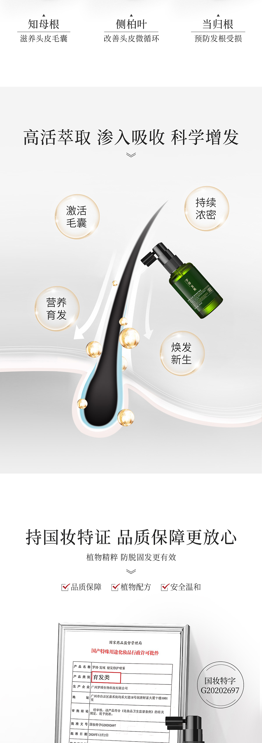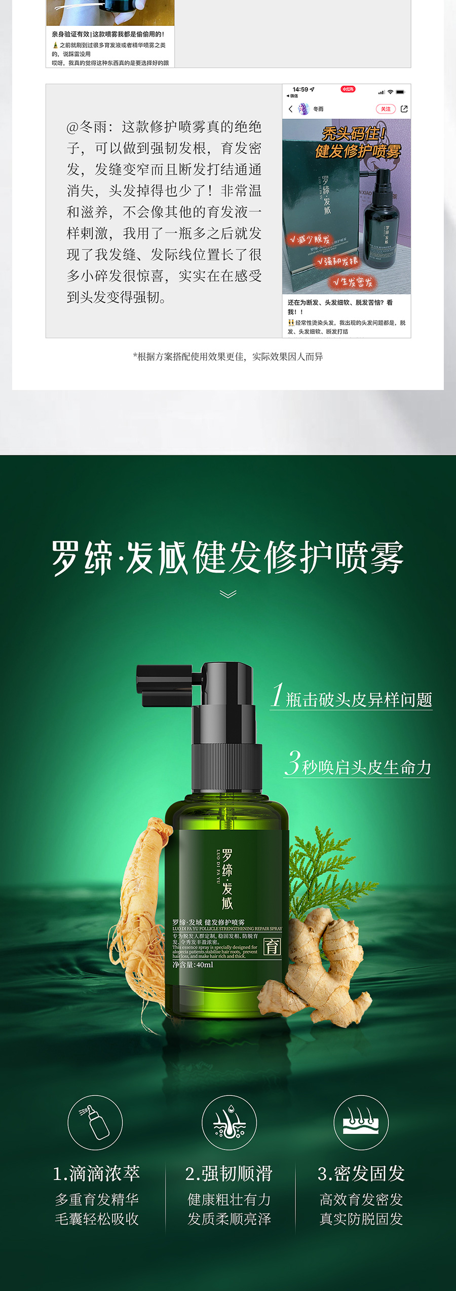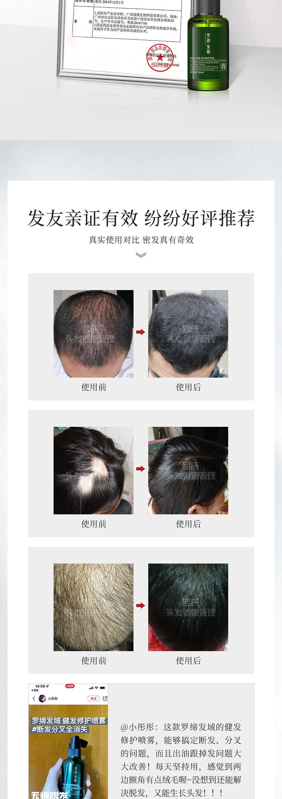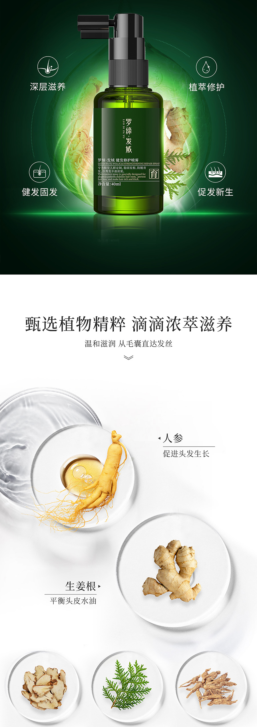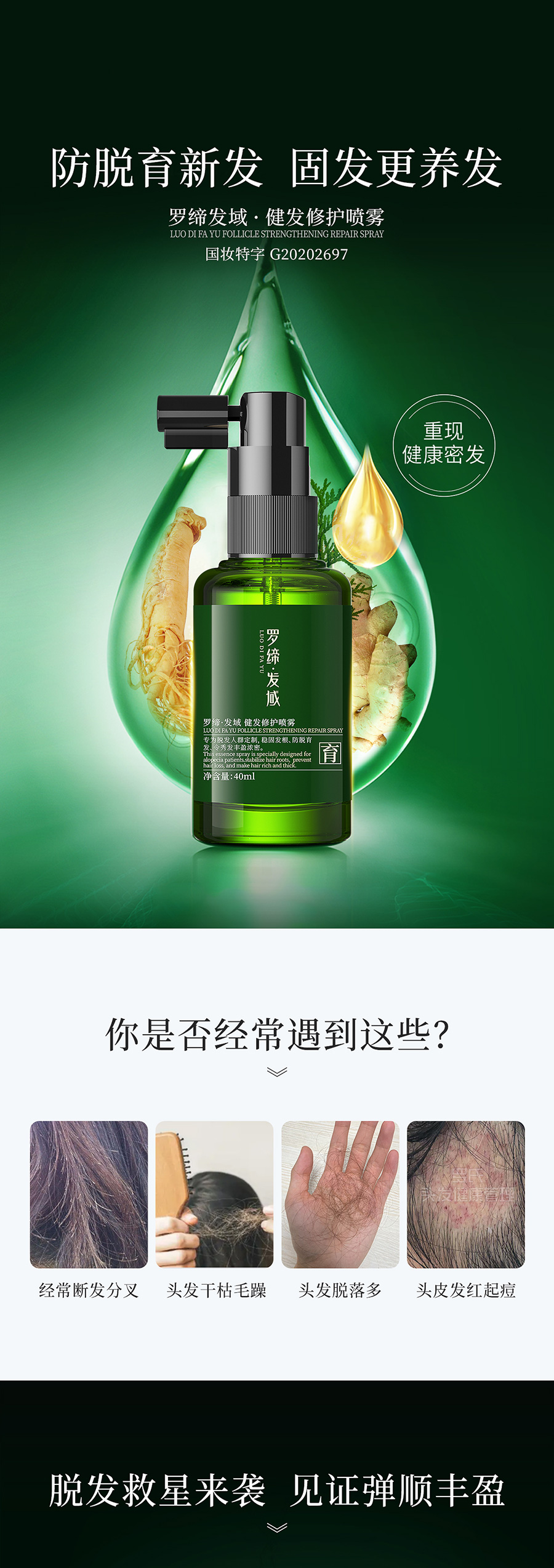LUO DI FA YU Follicle Strengthening repair spray适宜人群:适宜各发质人群使用。 作 用:本品萃取多种植物营养合力修护头发,改善油脂分泌,令头皮舒适,持续稳固发根,减少头发脱落,防脱育发,同时助力头发生长,令新发强韧弹滑,丰盈浓密。