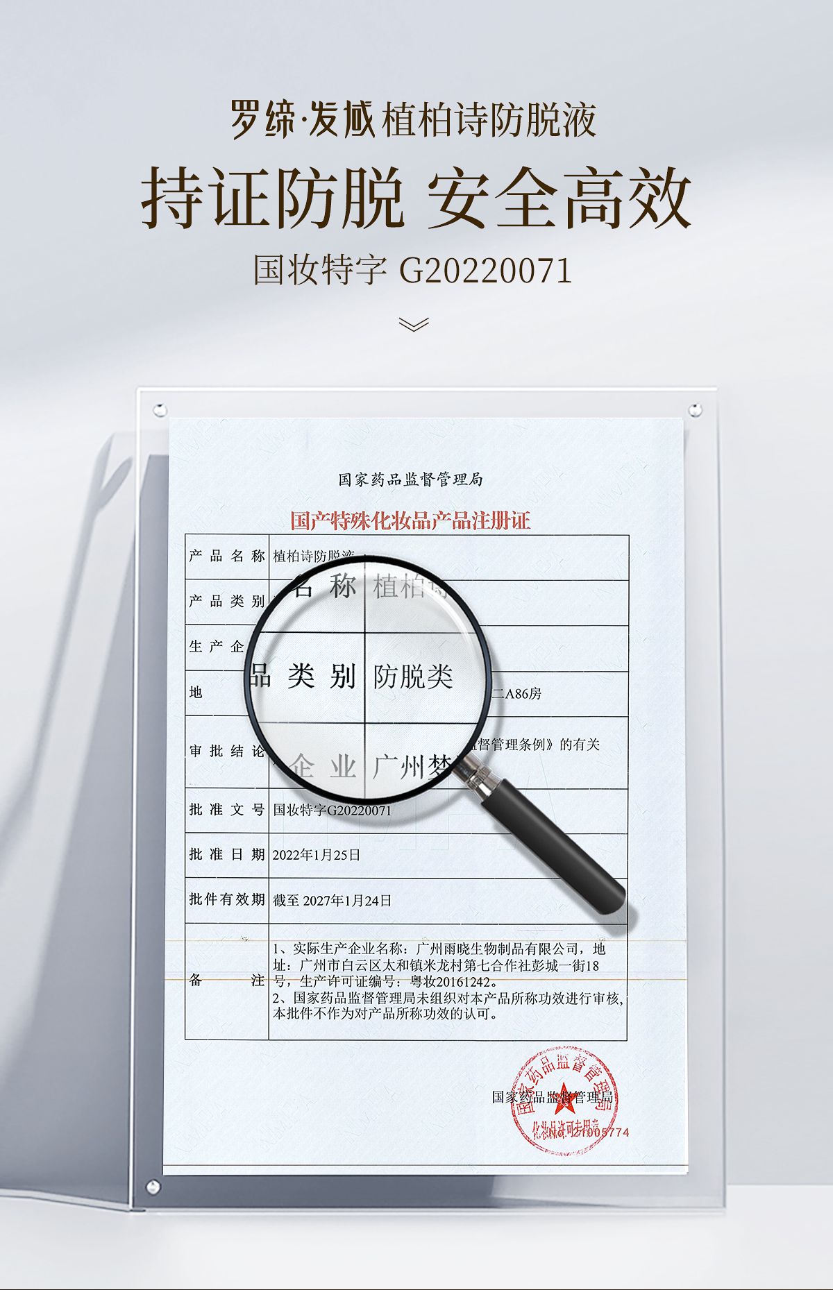 ZHIBAISHI Anti stripping liquid适宜人群:各种类型脱发人群。 作 用:含有当归根提取物、何首乌根提取物、侧柏叶提取物等草本植萃,柔润呵护发丝,润养头皮,养成坚韧发根,坚持使用减少脱发。